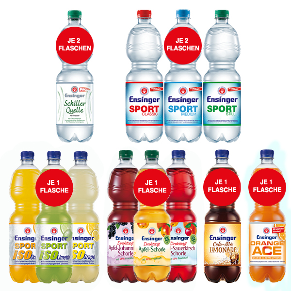 • Je 1 Flasche   1,0l Ensinger Direktsaftschorlen-Apfel, DS-Apfel-Johannisbeer und DS Apfel-Sauerkirschschorle, Sport ISO Grape, Sport ISO Orange, Sport ISO Limette, Cola-Mix und Orange ACE.